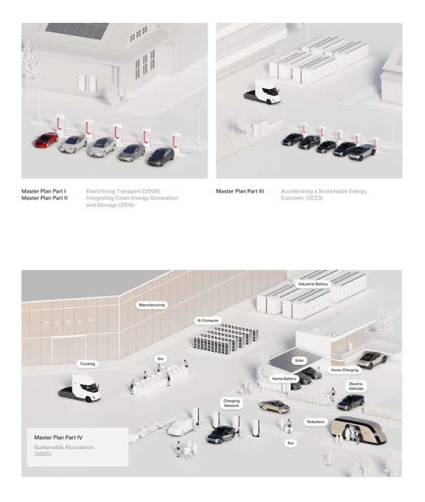 9月2日,特斯拉官方在X平台上正式发布“大师计划第四篇章”(Master Plan Part IV),全面改写公司的宏大叙事。它将公司的发展重心前所未有地从电动汽车和能源全面转向人工智能和机器人领域,旨在通过大规模地将AI融入物理世界,实现一个“可持续富足”的社会。